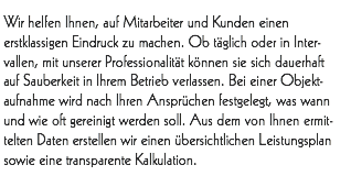 Wir helfen Ihnen, auf Mitarbeiter und Kunden einen erstklassigen Eindruck zu machen. Ob täglich oder in Intervallen, mit unserer Professionalität können sie sich dauerhaft auf Sauberkeit in Ihrem Betrieb verlassen. Bei einer Objektaufnahme wird nach Ihren Ansprüchen festgelegt, was wann und wie oft gereinigt werden soll. Aus dem von Ihnen ermittelten Daten erstellen wir einen übersichtlichen Leistungsplan sowie eine transparente Kalkulation.